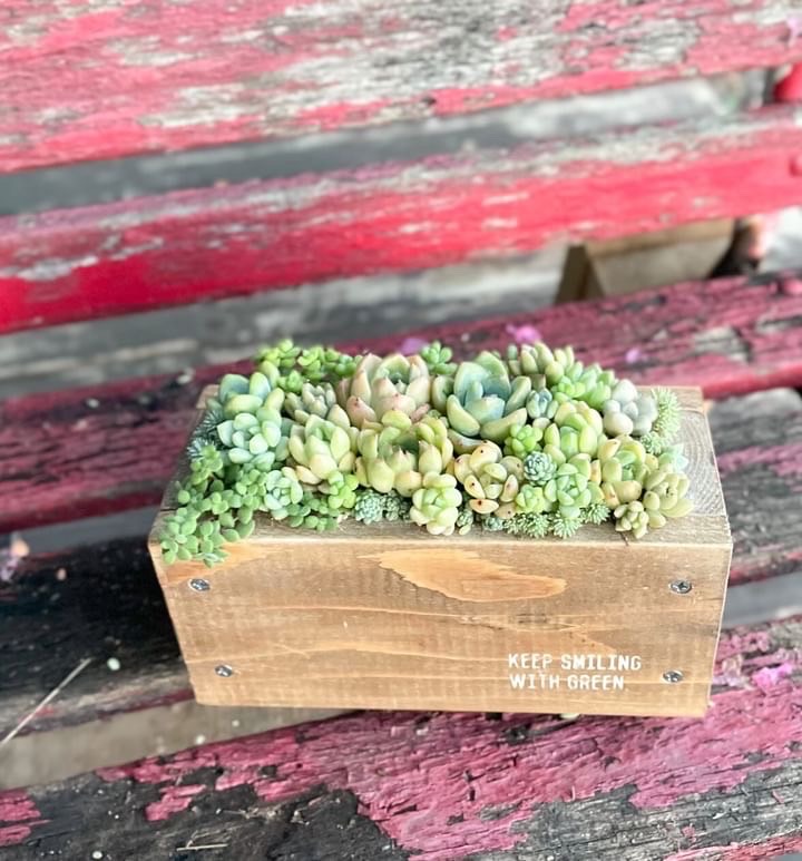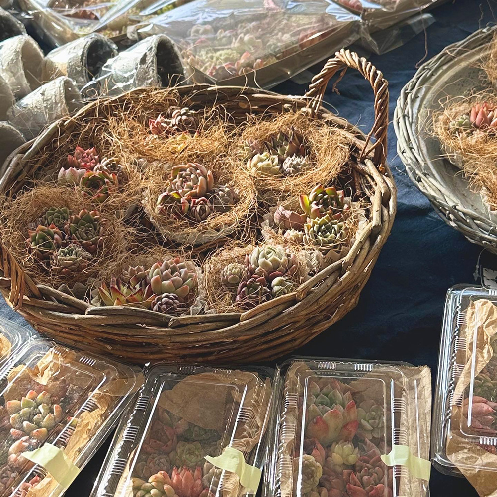 小さなリースやかごなど様々な器に多肉植物の色合いや葉姿を生かして寄せ植えを作ります。